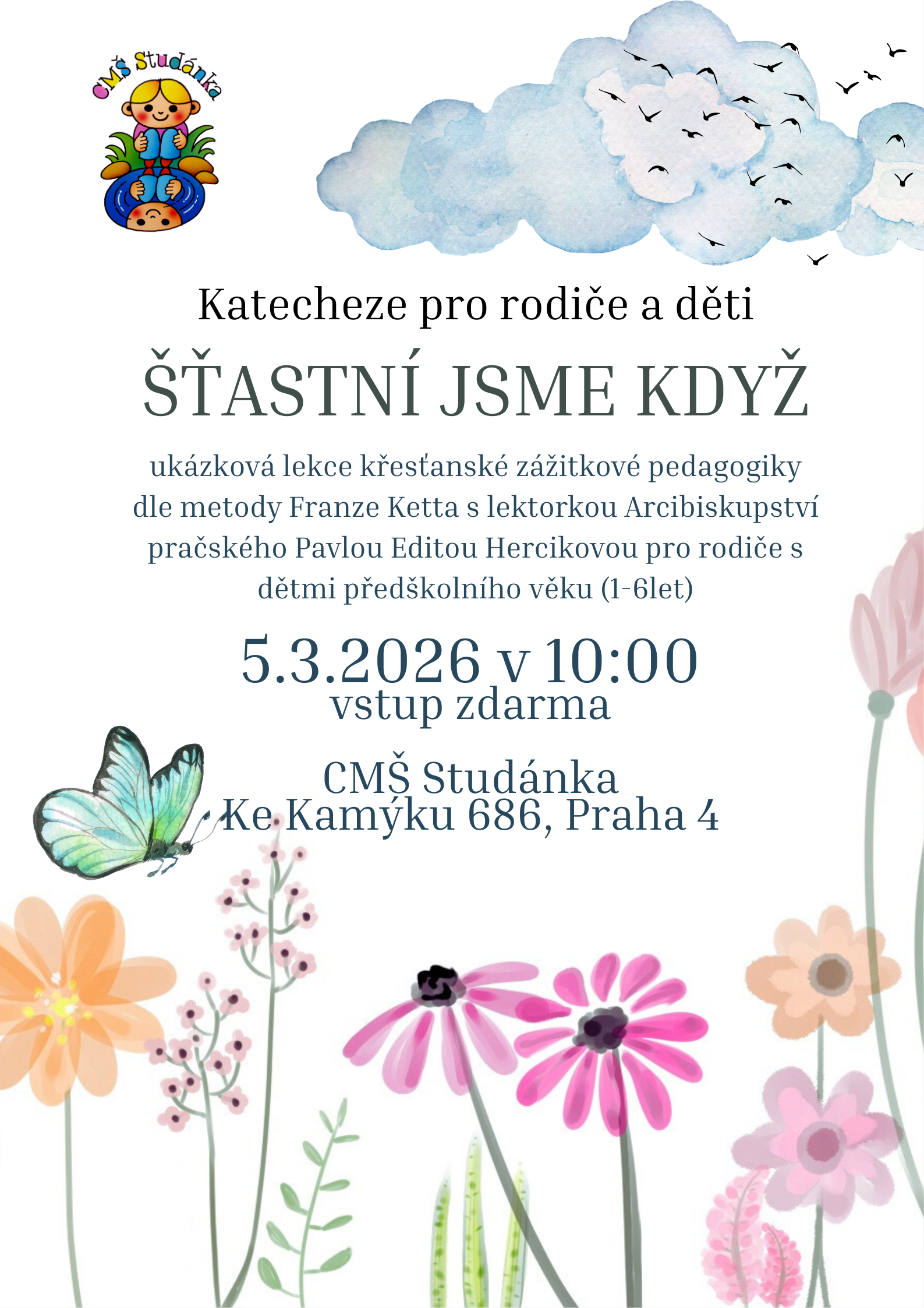 zveme Vás a vaše děti na ukázkovou lekci zážitkové pedagogiky na téma "Šťastní jsme když" dle metody Franze Ketta, která se bude konat 5.3.2026 v 10:00 v naší škole. Pavla Edita z Pedagogického centra Arcibiskupství pražského představí lekci katecheze koncipovanou pro rodiče s dětmi. Dle metodiky pracují během roku s dětmi paní učitelky, můžete tedy nahlédnout pod pokličku a zjistit, jakým způsobem jsou děti v naší škole vedeny.