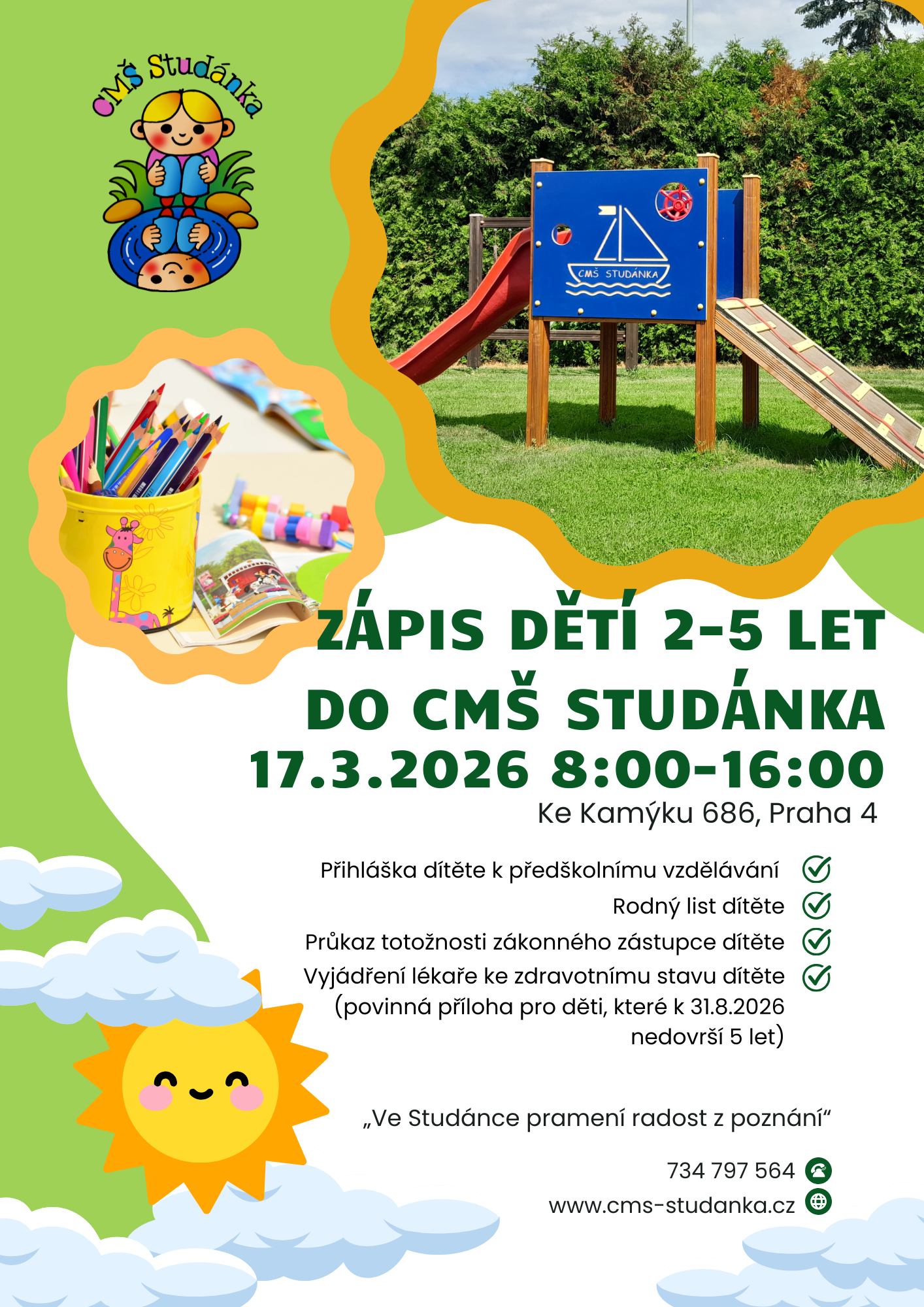 zveme Vás na Den otevřených dveří, který proběhne v naší škole v úterý 10.2.2026 v čase 15:00-17:00. Pro zájemce, kteří se k nám nebudou moci přijít podívat tento den, nabízíme možnost individuální konzultace po předchozí domluvě s paní ředitelkou. Kontakt pro sjednání termínu: cms.studanka@seznam.cz nebo tel. 734 797 564.